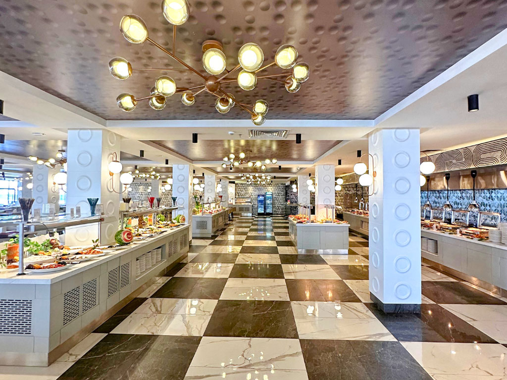 I huvudrestaurangen serveras bufféer morgon, middag och kväll. Under dagen erbjuds olika sorters snacks samt pizza, kebab, färsk frukt och kakor runtom på hotellområdet.