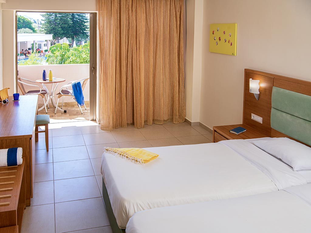 I dubbelrummen på 25 m² finns två riktiga sängplatser samt en extrasäng som mäter 185x80 cm. Rummen kräver minst två fullt betalande. Här kan ni bo max tre vuxna och det är möjligt att få ett barnpris. Rummen, som ligger i huvudbyggnaden, har antingen trädgårdsutsikt eller poolutsikt och du kan välja havsutsikt mot tillägg. Rummen kan också bokas som enkelrum mot ett tillägg.