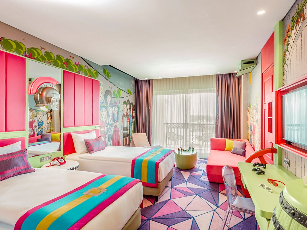 På långt avstånd kan du sen den stora nöjesparken Land of Legends, där berg- och dalbanor tornar upp sig och det vita slottet stoltserar med stora pelare och enorma statyer. När du kommer in på hotellet öppnar sig en ny värld – en värld full av fantasi, färger och kreativitet!