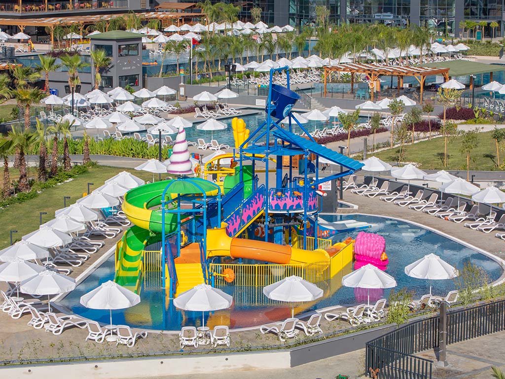 På hotellets poolområde finns en spännande vattenpark för barn och leksugna vuxna. Här finns fem färgglada större vattenrutschbanor och även ett lite mindre plaskområde för de allra yngsta barnen. Därtill kan barnen prova att bli rejält nerstänkta i plaskområdet för barn som är lite större.