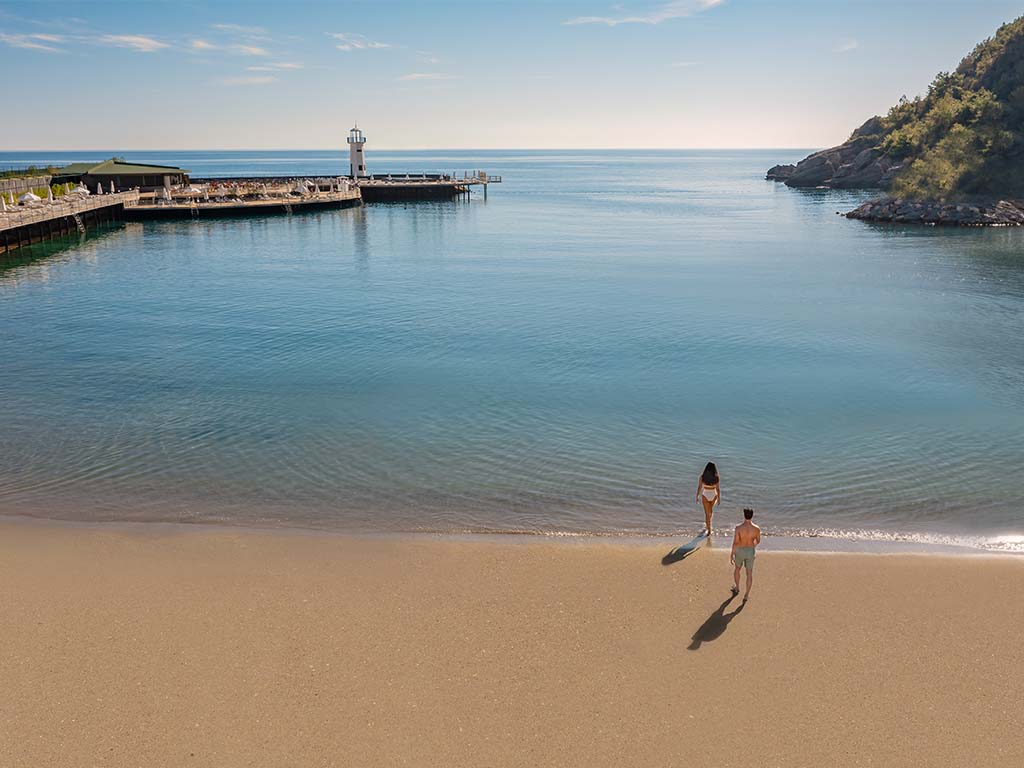 Mylome har en egen sandstrand i en privat liten bukt precis på poolområdet. Här kan du antingen vila i sköna solsängar eller hyra en ståtlig strandpaviljong som ligger vid sidan av stranden, eller längs den charmanta piren.
