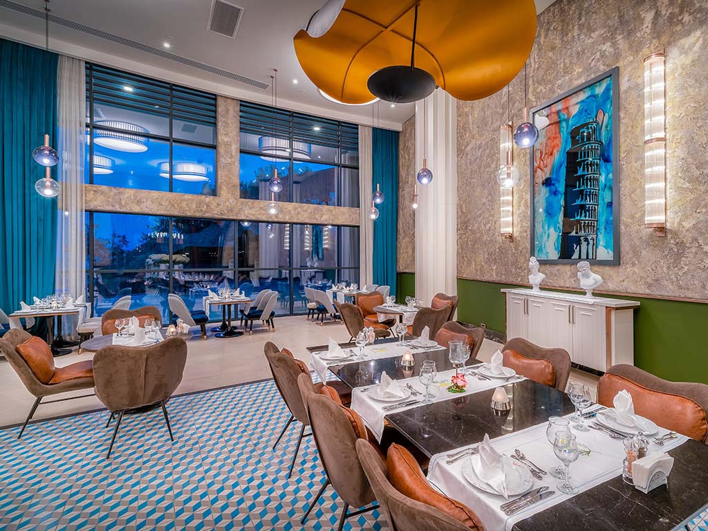 Hela fyra. De stämningsfulla restaurangerna i huvudbyggnaden erbjuder turkisk, asiatisk och italiensk mat, och nere vid vattnet ligger en fiskrestaurang.