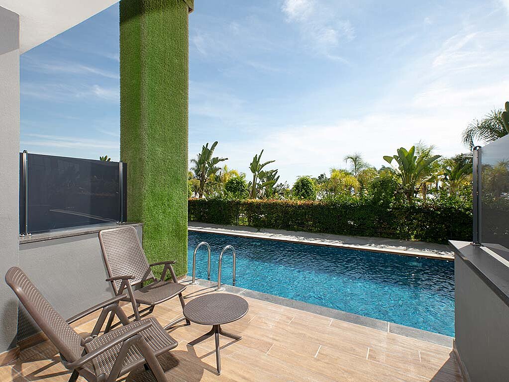 I dubbelrummet med swim up-pool och landutsikt på 33 m² finns tre riktiga sängplatser. Rummet kräver minst tre fullt betalande, här kan bo max tre vuxna och det är möjligt att få barnpris för ett barn.