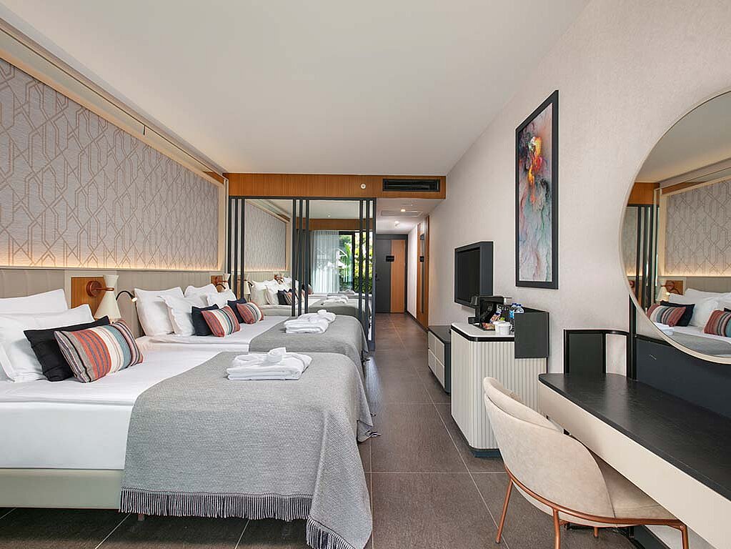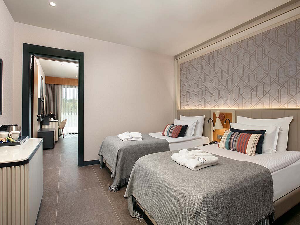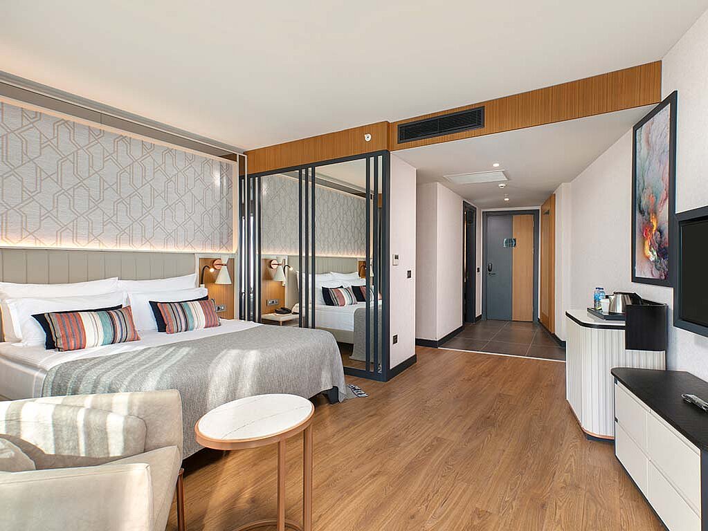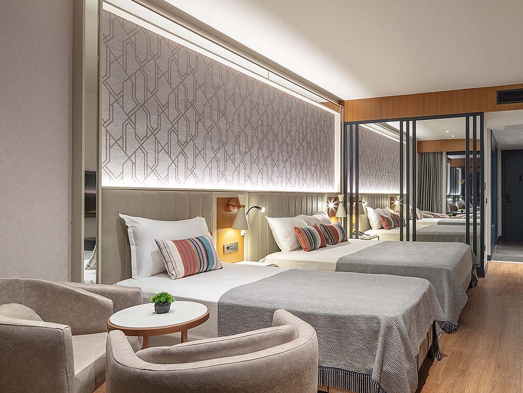 I familjesviten på 50 m² finns fyra riktiga sängplatser. Rummet kräver minst tre fullt betalande, här kan bo max fyra vuxna och det är möjligt att få barnpris för ett barn. Du kan välja att uppgradera den här rumstypen till en familjesvit med swim up-pool och landutsikt mot ett tillägg.