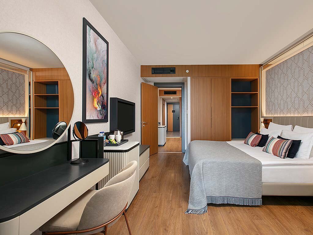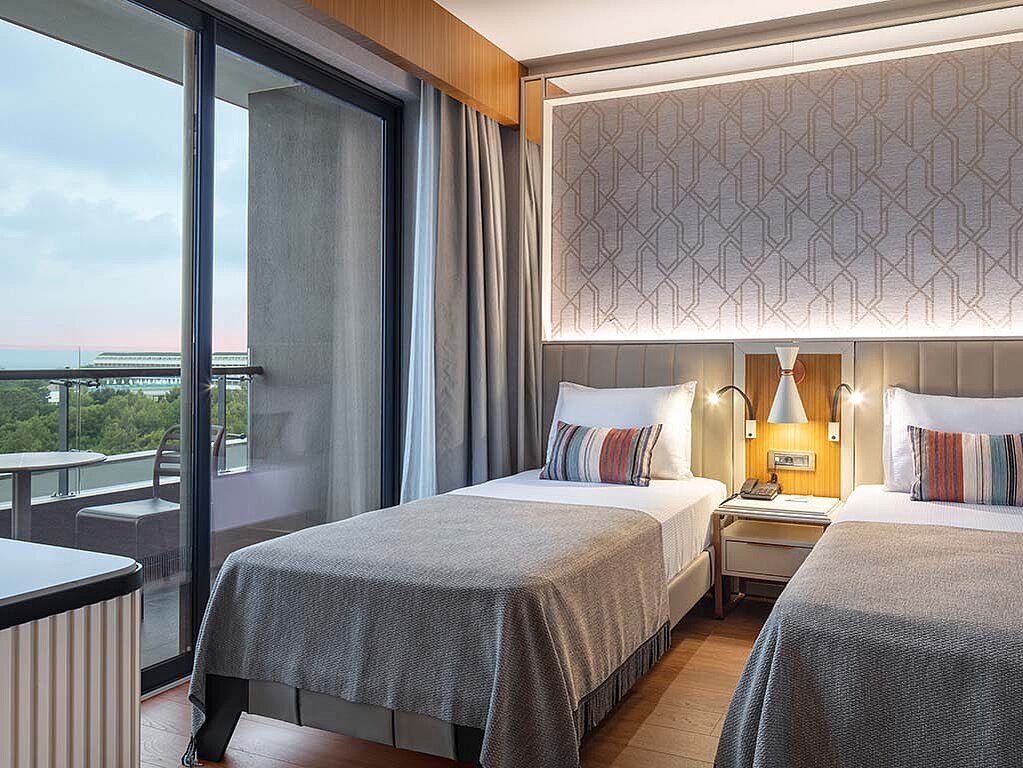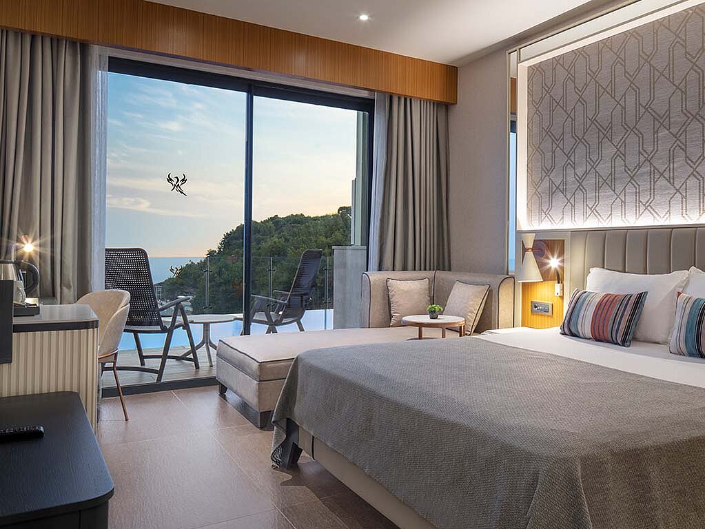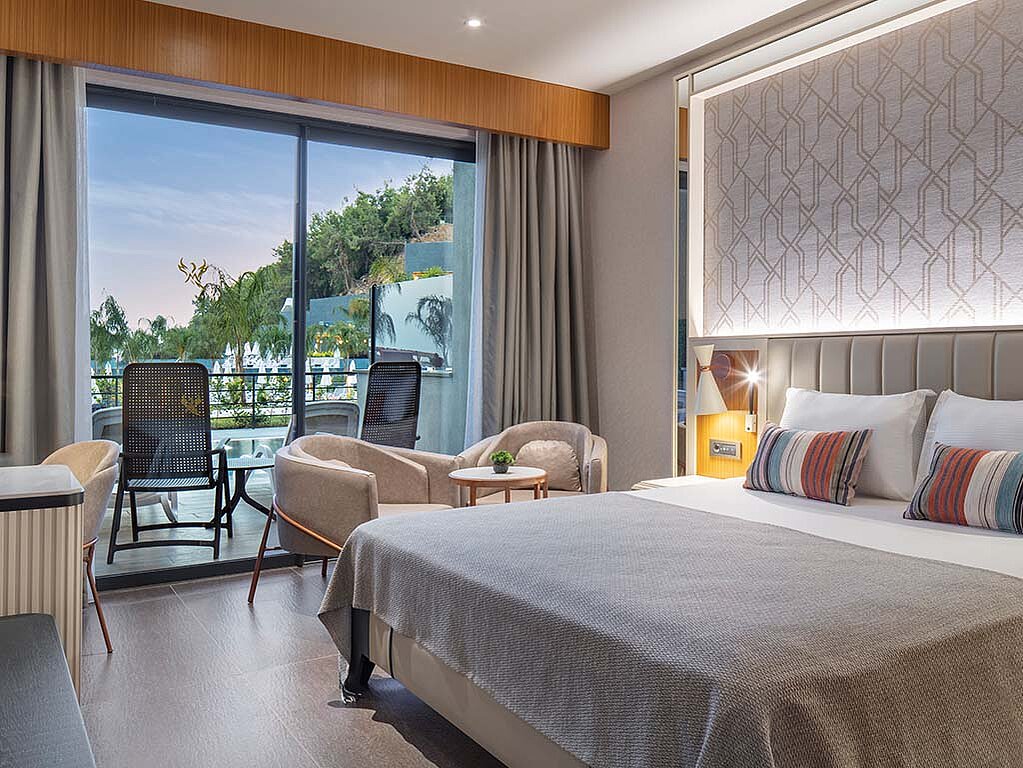 I dubbelrummet på 33 m² finns tre riktiga sängplatser. Rummet kräver minst två fullt betalande, här kan bo max tre vuxna och det är möjligt att få barnpris för ett barn. Du kan välja att uppgradera den här rumstypen till ett dubbelrum med swim up-pool och havsutsikt mot ett tillägg.