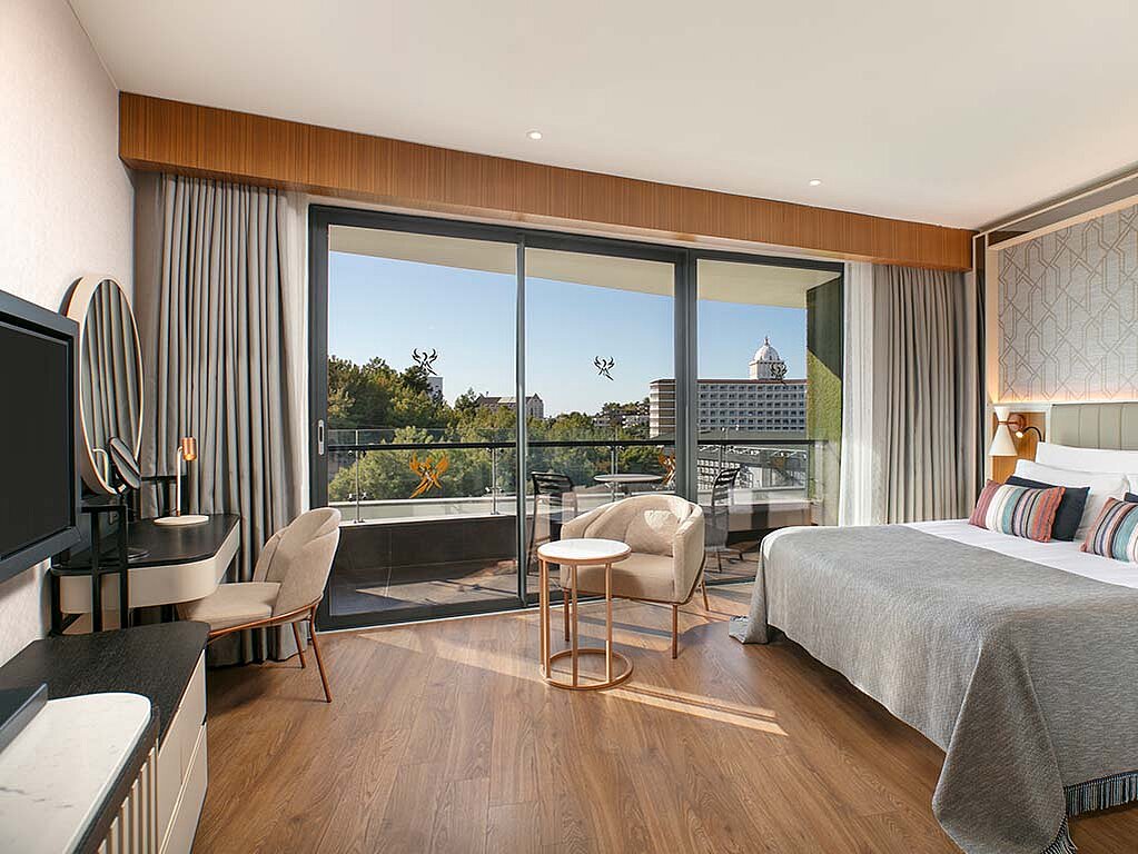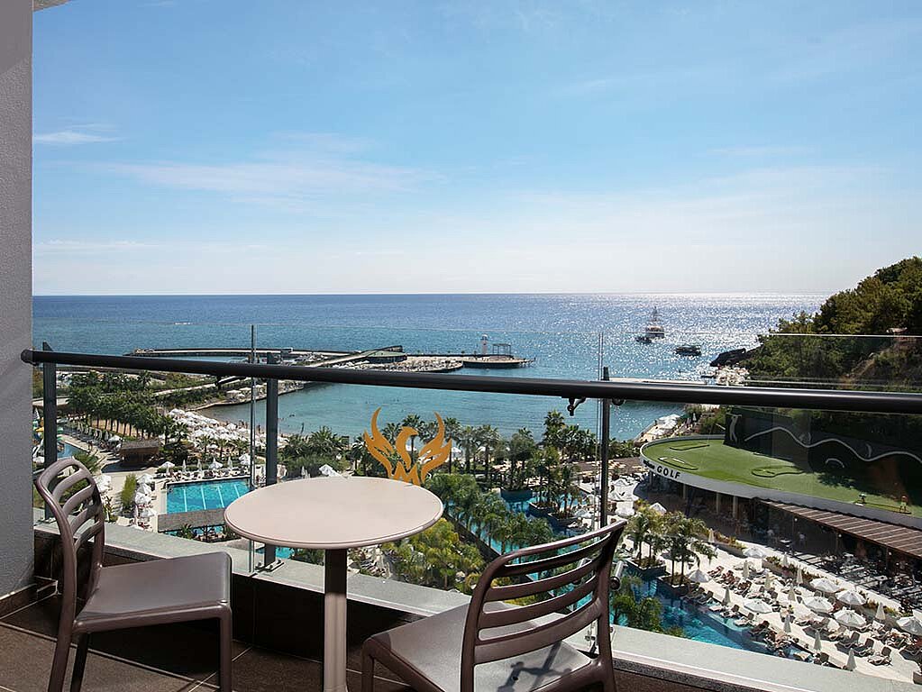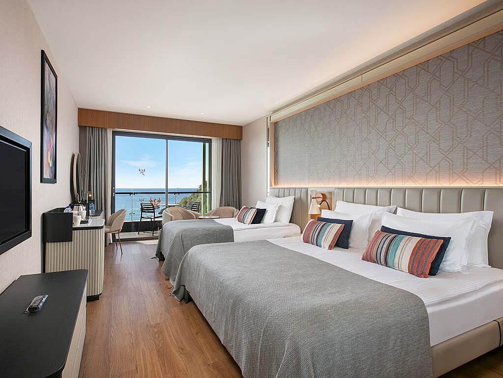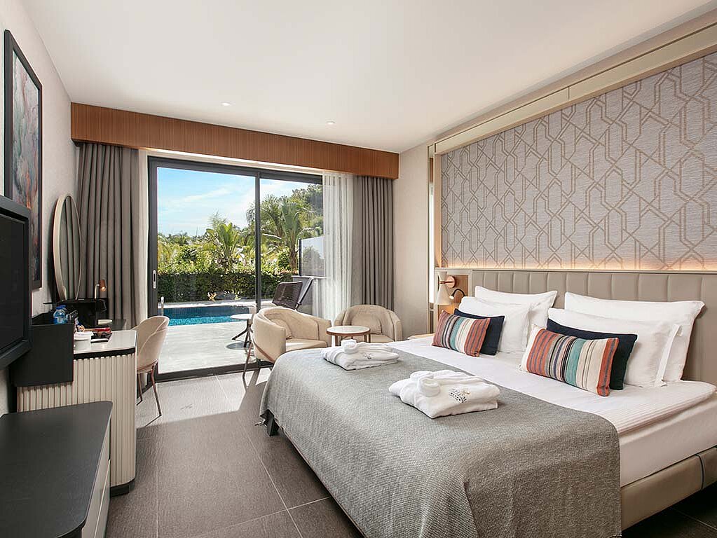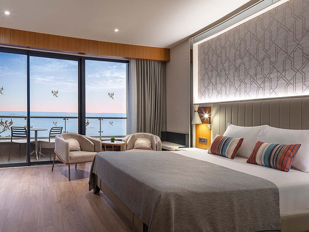 I dubbelrummet på 33 m² finns tre riktiga sängplatser. Rummet kräver minst två fullt betalande, här kan bo max tre vuxna och det är möjligt att få barnpris för ett barn. Du kan välja att uppgradera den här rumstypen till ett dubbelrum med swim up-pool och havsutsikt mot ett tillägg.