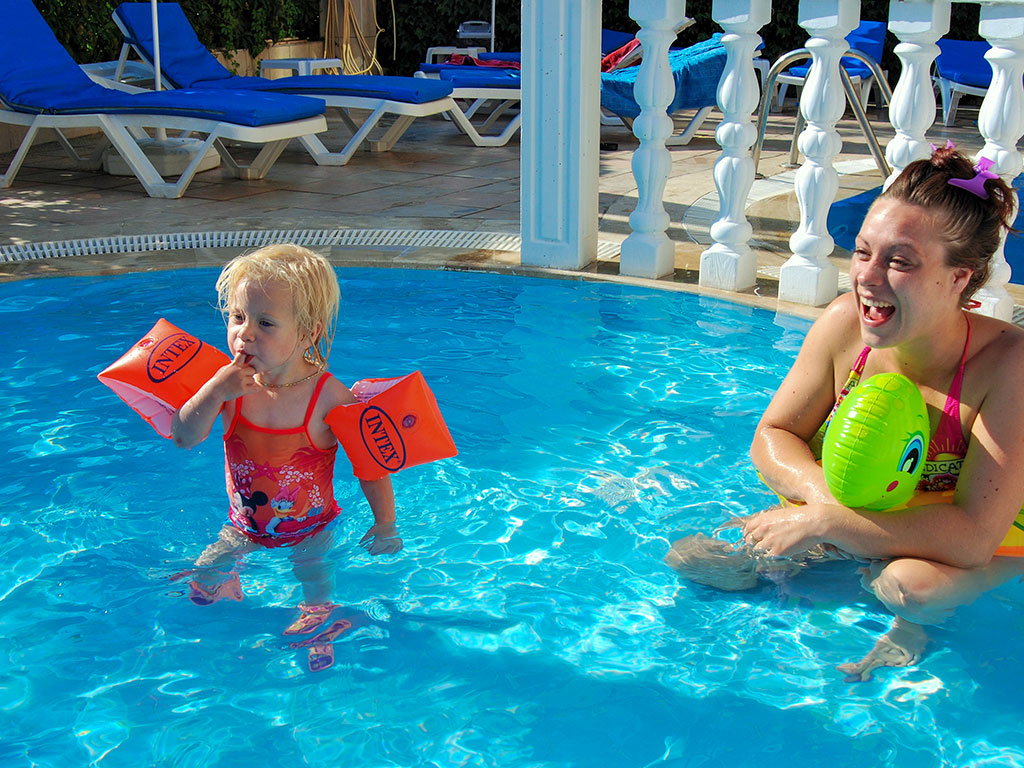 På det lilla gemytliga poolområdet råder en härlig semesterstämning och här finns både en pool och en separat barnpool med en vattenrutschbana för de minsta. Runtom poolerna står solsängar och parasoller uppradade till fritt förfogande. Poolbaren är öppen hela dagen och serverar olika sorters goda drycker och drinkar, mot betalning.