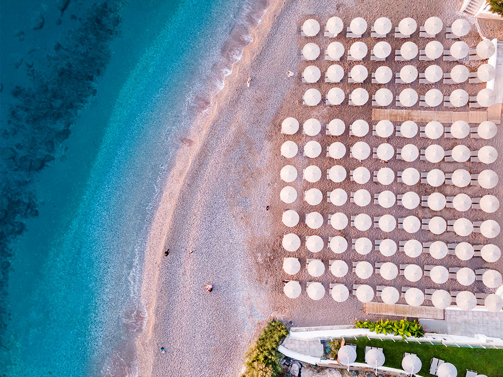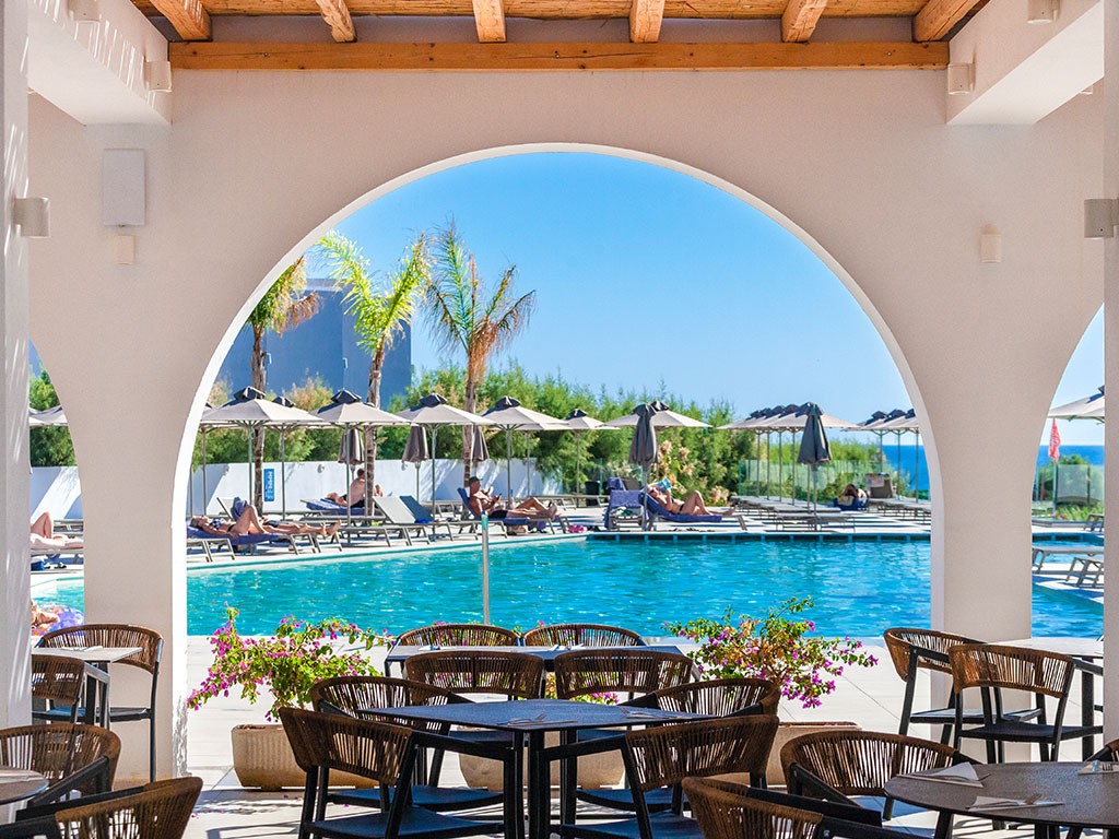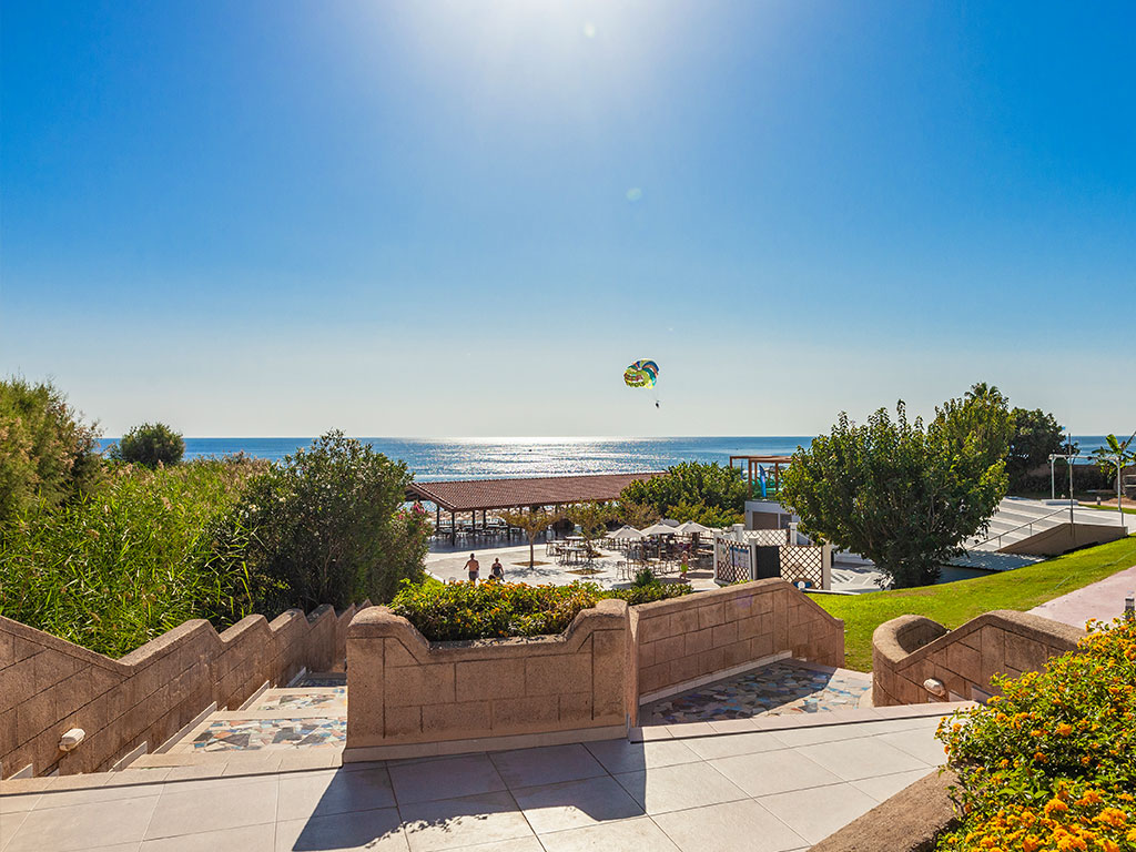 Hotellet ligger precis vid havet. Trappstegen ner till vattnet pryds av mosaik, och du har sällskap av ståtliga klippor när du kastar dig i det himmelsblå havet. Under skyddet av stråparasoller med fötterna i småstensblandad sand ligger du bra här – hela dagen om du vill!