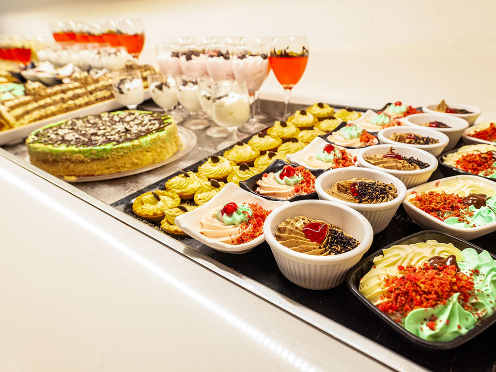 I den gröna huvudrestaurangen finns mycket att välja på, fräscht och enkelt uppdukat som buffé. Till lunch finns grekiska och internationella maträtter tillsammans med visst utbud för dig som vill äta hälsosamt. Glutenfri och laktosfri kost, kost för diabetiker och kost vid olika allergier erbjuds vid förfrågan.