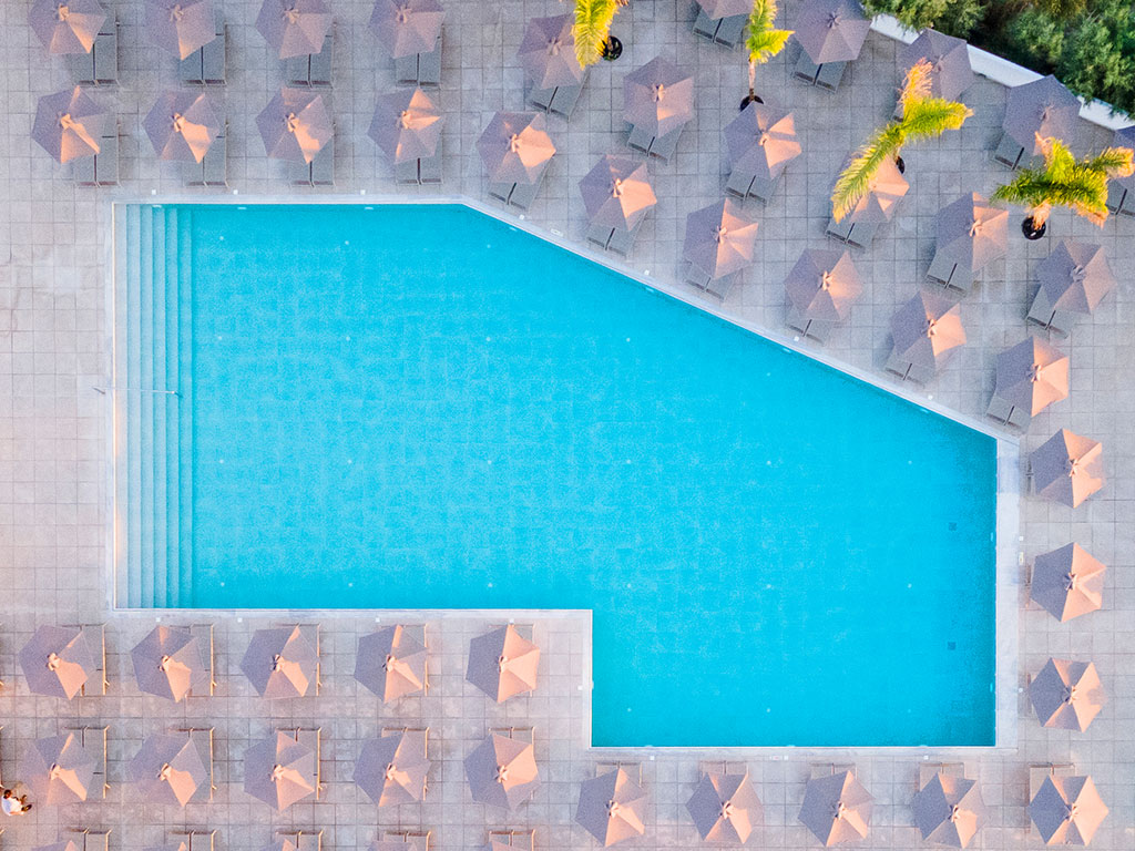 Blue Sea Island har totalt fyra pooler. En pool vid vardera av de två hotellbyggnaderna, en pool med små vattenrutschbanor och en inomhuspool. I gult, vitt och ljusblått ligger Blue Sea Islands minivattenpark redo att ta emot glada små barn. Vattenparken har fyra rutschbanor. Både solsängar och parasoller ingår vid alla pooler.