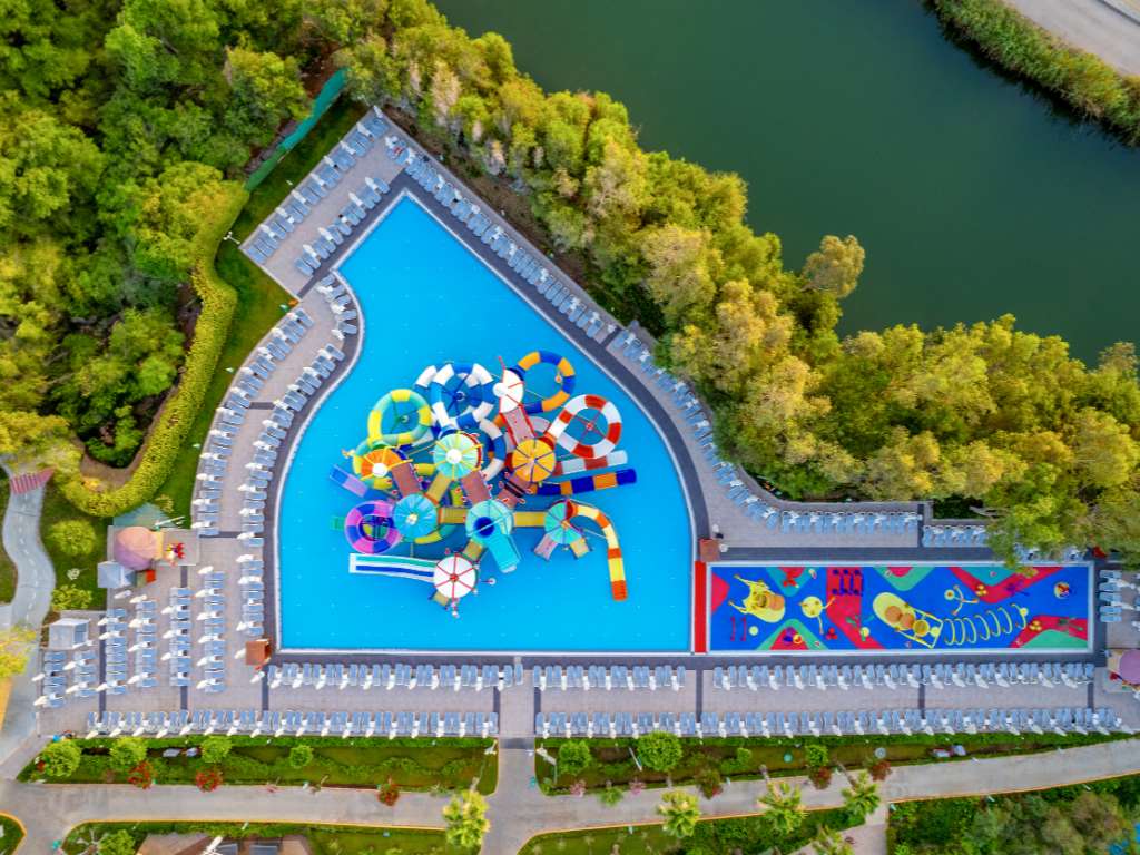 För adrenalinjunkies har familjehotellet två häftiga vattenparker – en med sju vattenrutschbanor för mindre barn samt en lite tuffare med nio stycken som är mer lämpade från 12 år och uppåt. Runt den stora vattenparken slingrar sig en lazy river, där du kan flyta runt och njuta av solen. Det finns även ett roligt lekområde med halksäker beläggning, vattensprutande fontäner och olika hinder – med andra ord perfekt för de mindre barnen att springa omkring och busa i.