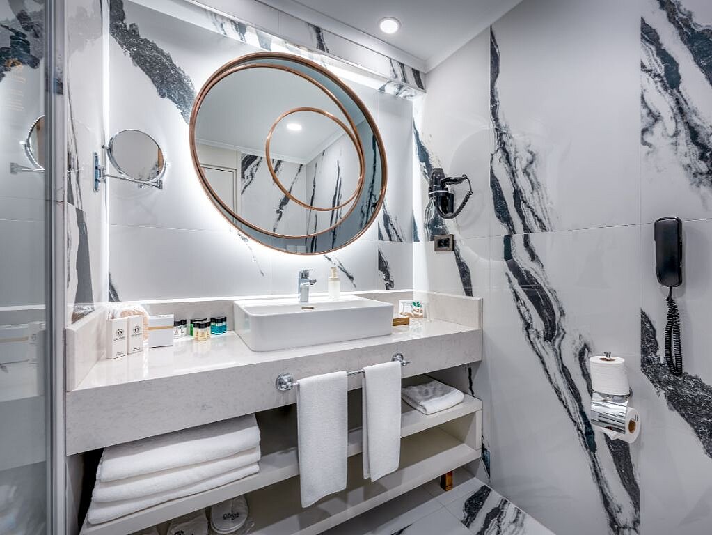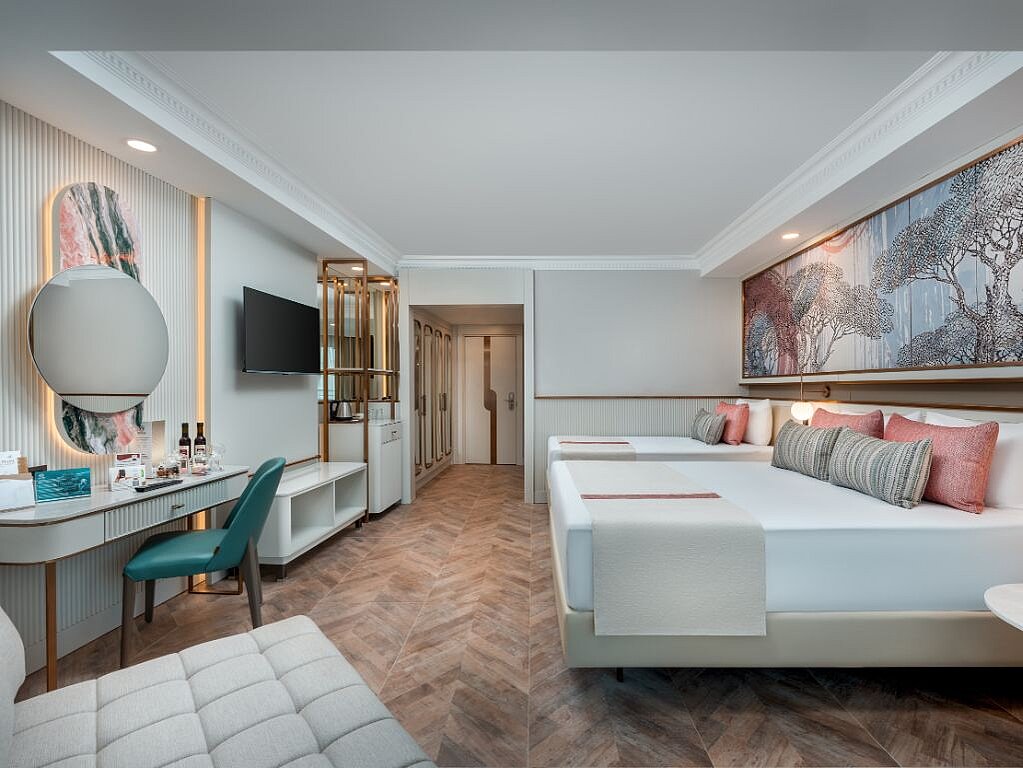 Alla rum har balkong, central luftkonditionering, tv, safety box, minibar som fylls på dagligen, laminatgolv eller klinkers och vattenkokare. På badrummen finns duschkabin och hårfön. Wifi är kostnadsfritt på rummen.