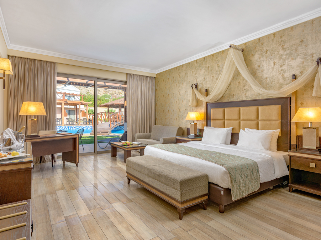 Deluxerummet har direkt tillgång till pool, och är 46 m², så här finns gott om plats. Här finns två riktiga sängplatser och en bäddsoffa på 190x110 cm. Rummet kräver minst två fullt betalande och där kan bo max tre vuxna. Detta rum ligger i den lugna avdelningen reserverad för vuxna, och man måste vara minst 16 år gammal för att bo här. I denna lite lyxigare rumstyp får du privat incheckning, välkomstdrink, möjlighet för tidig incheckning och sen utcheckning (om det finns lediga rum) samt möjlighet att kostnadsfritt besöka à la carte-restaurangerna varje kväll i mån av plats – kom bara ihåg att boka en dag i förväg. För dig som bokar detta rum erbjuds även frukost i en separat restaurang med buffé.