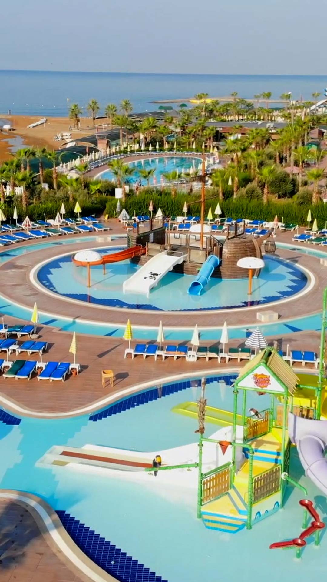 Stor beach club med pooler, vattenrutschbanor och flera restauranger för alla.